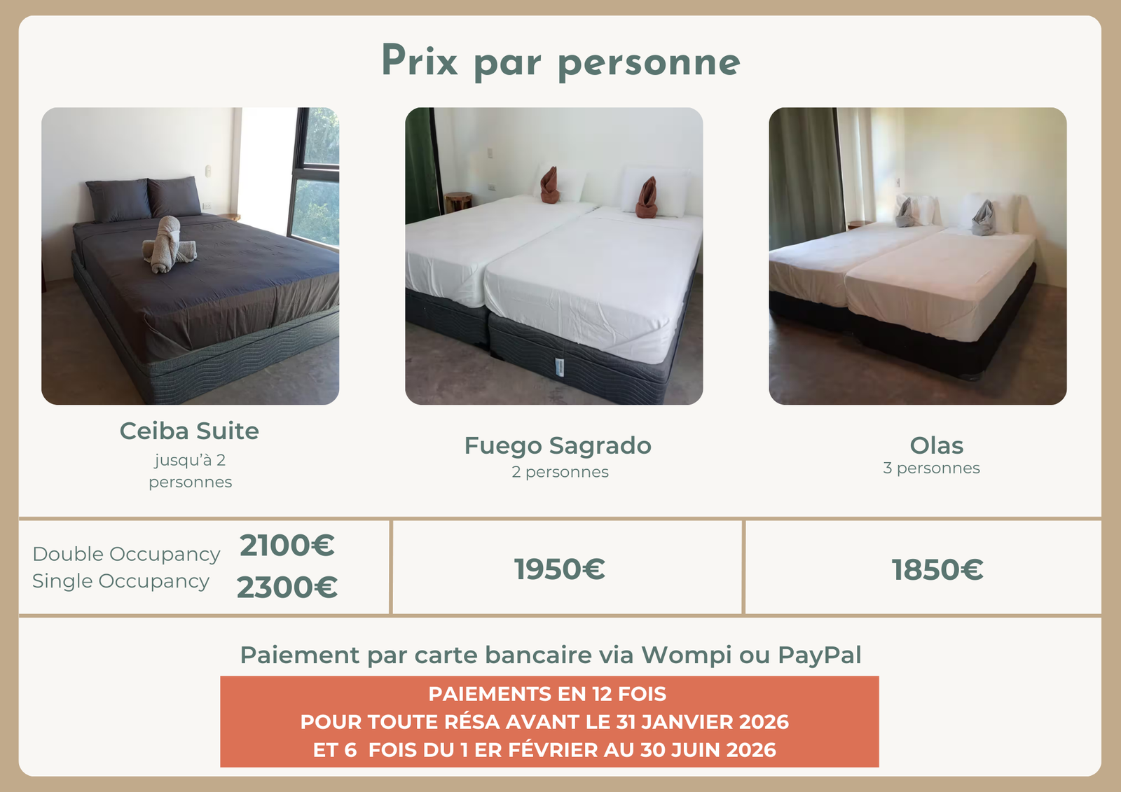 - Price: 2300 € per person ( single occupancy) .
